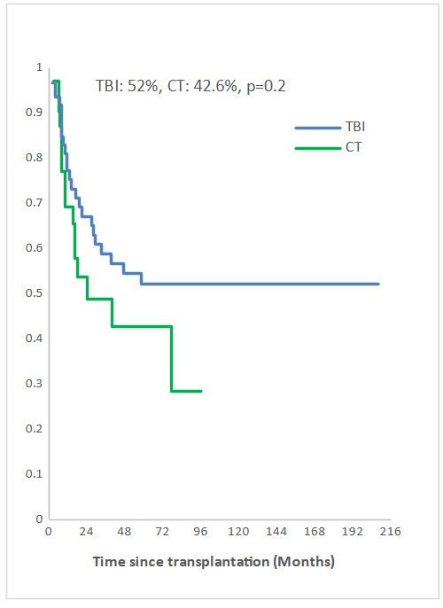 The 5-year OS and EFS were also not significantly different in the F-TBI and CT groups. Most previous studies reported better survival with TBI-based.2 Eder et al demonstrated that EFS was significantly better with TBI in patients transplanted in CR1 compared to those transplanted in subsequent CR.3 We expected to have survival improvement in TBI group given the significant reduction of relapse risk in this group and similar NRM in both groups. The absence of significant differences in survival might be explained by a higher number of patients with Ph+ ALL in CT group. All patients who had molecular relapse were treated with tyrosine kinase inhibitors (TKIs) and the majority of these patients are alive.