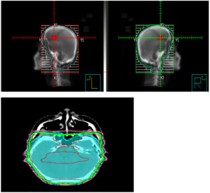 Figure 1.CRB and isodose line distribution (CRB: Cranial radiation boost) (CRB: cranial radiation boost; PBSC: peripheral blood stem cells, BM: bone marrow, CB: cord blood).