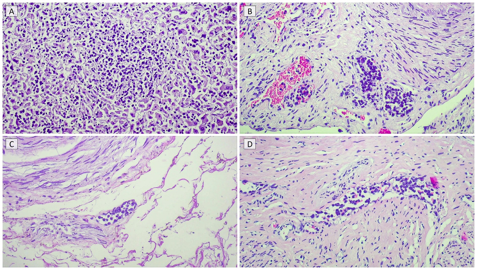 Microscopic examination of internal organs - including the spleen, liver, lungs, ovaries, uterus, bladder, and colon - revealed exclusively intravascular localization of neoplastic cells without parenchymal infiltration or mass formation (Figure 2, A-D). No lymph node involvement was observed, and the bone marrow showed only focal intravascular tumor cell aggregates. Outside the skin, the lymphoma was confined entirely to the lumina of vessels.