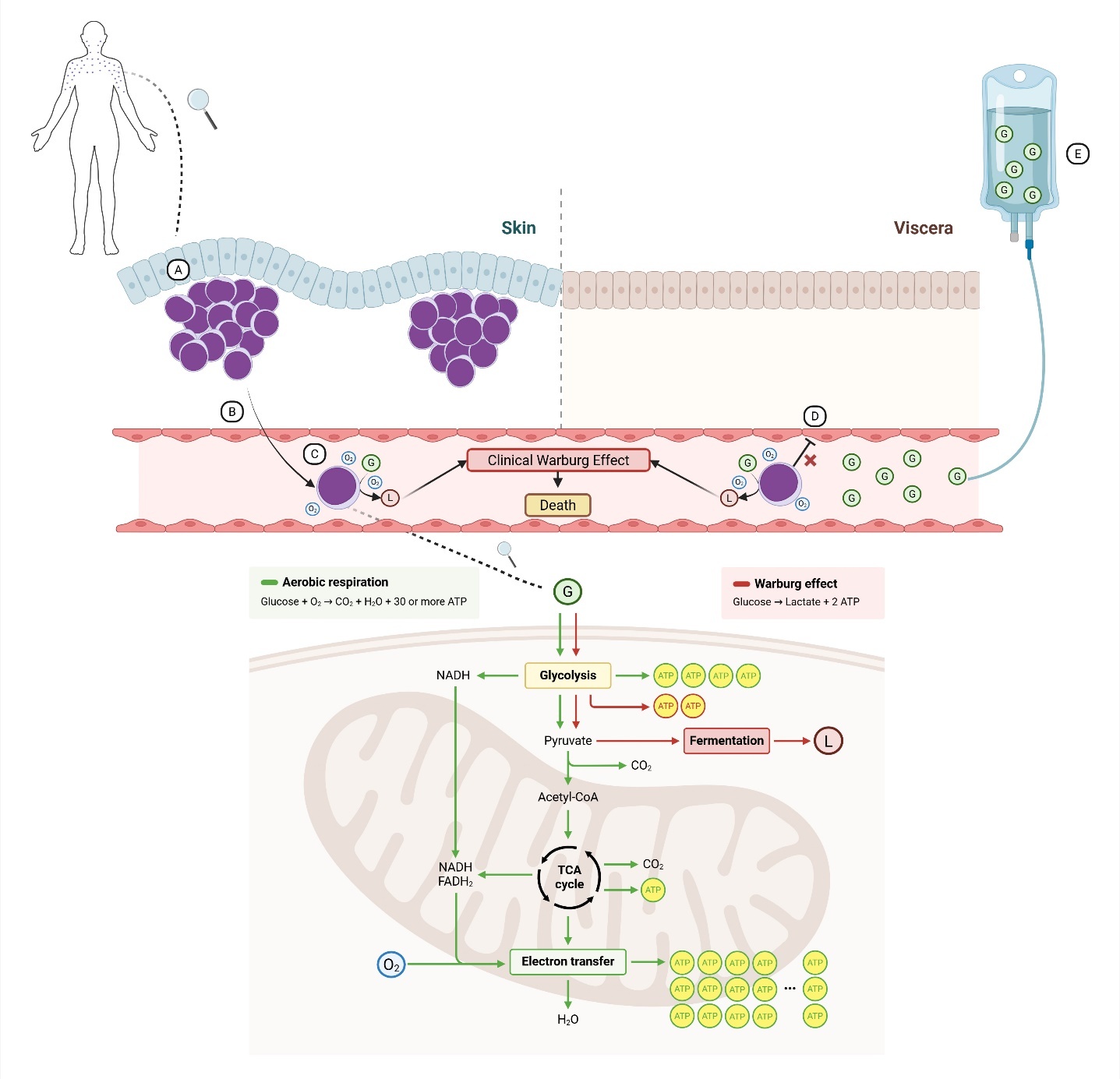 These findings were consistent with the diagnosis of an extranodal diffuse large B-cell lymphoma with both cutaneous mass-forming and systemic intravascular involvement. Death was attributed to fulminant type B lactic acidosis and hypoglycemia resulting from tumor-driven glycolysis, despite preserved oxygenation - a clinical Warburg effect. Notably, repeated glucose infusions, intended to correct hypoglycemia, likely exacerbated lactate production, paradoxically accelerating clinical deterioration.
