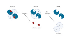 In plasma, FXIII circulates primarily as a non-covalent A2B2 heterotetramer in which the catalytic A subunits (FXIII-A, encoded by F13A1) are chaperoned and stabilized by the carrier B subunits (FXIII-B, encoded by F13B).14–16 The F13A1 gene (chromosome 6p24–p25; 15 exons) encodes a 731-amino-acid catalytic subunit that contains the transglutaminase core, while F13B (chromosome 1q31–q32.1; 12 exons) encodes a β-propeller/short-consensus-repeat protein composed of 10 sushi domains that confer plasma stability and transport.17–21 Deficiency of the FXIII-A subunit is responsible for the majority (~95%) of cases of congenital FXIII deficiency, and typically produces more severe clinical phenotypes due to loss of catalytic activity, whereas FXIII-B subunit defects mainly lower circulating heterotetramer levels by impairing stabilization and carriage.22–24