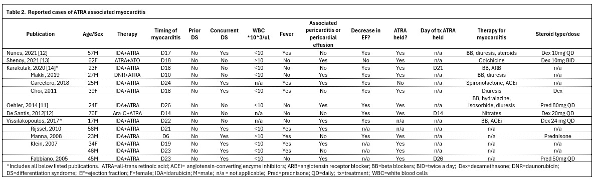 There are no established guidelines for treatment of ATRA-associated myocarditis. In most published cases, ATRA therapy was withheld, and corticosteroids were added, as myocarditis was attributed to severe DS. Treatment for myocarditis itself varied widely in the literature, with patients primarily receiving guideline-directed medical therapy for heart failure with reduced ejection fraction and diuresis.11,13,14,16 Lastly, recommendations on when to resume ATRA therapy are lacking. According to our literature review, 10 of 13 patients were able to successfully resume ATRA therapy, which suggests ATRA re-challenge following myocarditis may be feasible.11–13,15,16