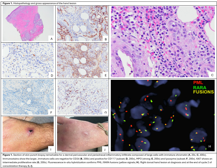 Bone marrow biopsy showed hypercellularity (>95%) with 49% abnormal promyelocytes (bright CD33+, partial dim CD34+, dim CD45+, CD117+, HLA-DR-). t(15;17)/PML::RARA FISH was positive in 33.5% cells, confirming low-risk APL. Due to the patient’s history of rabbit handling and concern for a zoonotic skin infection, a punch biopsy of the right-hand lesion was performed, revealing an infiltrate of large, myeloperoxidase-positive cells morphologically identified as promyelocytes. Positive t(15;17)/PML::RARA FISH on this tissue sample confirmed cutaneous APL (Figure 1).