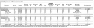 Myocarditis is a rare complication of ATRA, with its exact etiology still unclear. Some clinicians believe that it represents DS and should be treated as such. In the literature, myocarditis symptoms appear an average of 19 days after therapy initiation (Table 2).11–16 Notably, none of the reported patients had DS prior to onset of myocarditis, although nearly half exhibited concurrent DS symptoms at the time of myocarditis diagnosis. The typical onset of classic DS with ATRA is 7-12 days, making the delayed onset of DS and myocarditis at day 19 unusual.2 A new decline in ejection fraction has been documented in 9 of 10 reported cases, with all patients regaining normal cardiac function without long-term sequelae. Distinguishing ATRA-associated myocarditis from DS is challenging, due to common features of pleuropericardial effusion, pulmonary infiltrates, hypotension and volume overload. While fever and leukocytosis may suggest the underlying etiology, these signs and symptoms are also non-specific, with only 7 of 13 cases reporting fever, and only 2 of 11 cases reporting leukocytosis at symptom onset.
