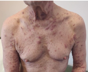 In April 2020, new erythematous plaques developed on the trunk, neck, and upper limbs (Figure 1), coinciding with a sharp increase in the IgA-kappa paraprotein level (35 g/L) and a free light chain ratio >100. EBV-DNA was 68,280 copies/mL. Skin biopsy revealed a dermal infiltrate of clonal plasma cells (CD38+, CD138+, MUM1+, CD56±, IgA-kappa+) consistent with cutaneous myeloma. FISH demonstrated TP53 deletion; Epstein-Barr virus-encoded small RNA (EBER was negative in plasma-cells. Repeat bone marrow biopsy showed no evidence of AITL or myeloma. A new PET/CT scan showed persistence of FDG uptake in the small lung nodule, while no FDG lesions were detected in the bones and other organs. The patient received pomalidomide, bortezomib, and dexamethasone, but the disease rapidly progressed. He developed acute renal failure and died of sepsis in June 2020.